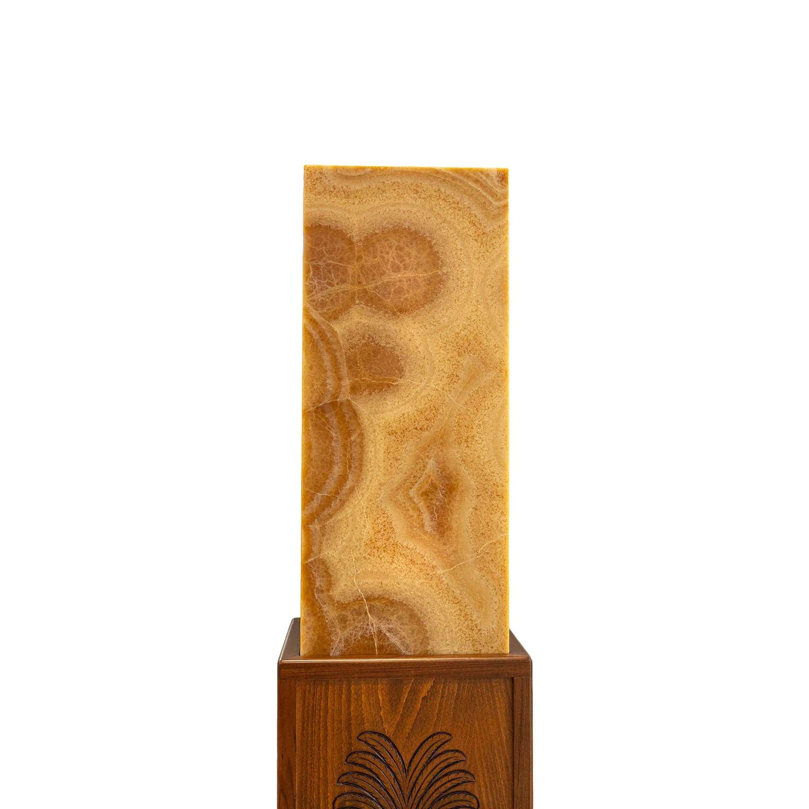 Carved from Evia Onyx, the Oasis Horizon Light reimagines the stone through an Arabian lens, drawing out the warm amber tones and concentric mineral patterns that echo desert horizons.