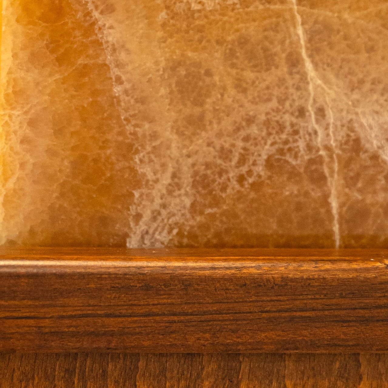 When illuminated, the onyx reveals gentle golden currents that shift softly across the surface, evoking the atmospheric glow of sunset over sand and stone.