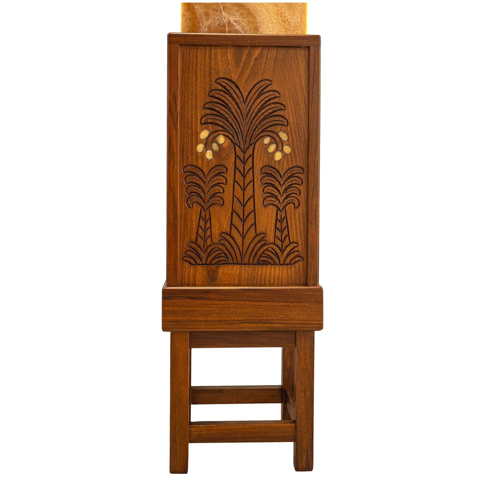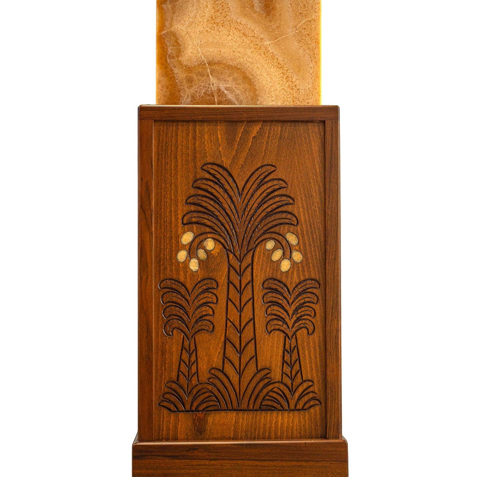 Its sculpted wooden base, adorned with palm motifs, reinforces the dialogue between natural material and cultural symbolism — a motif deeply rooted in the landscapes of the Middle East.