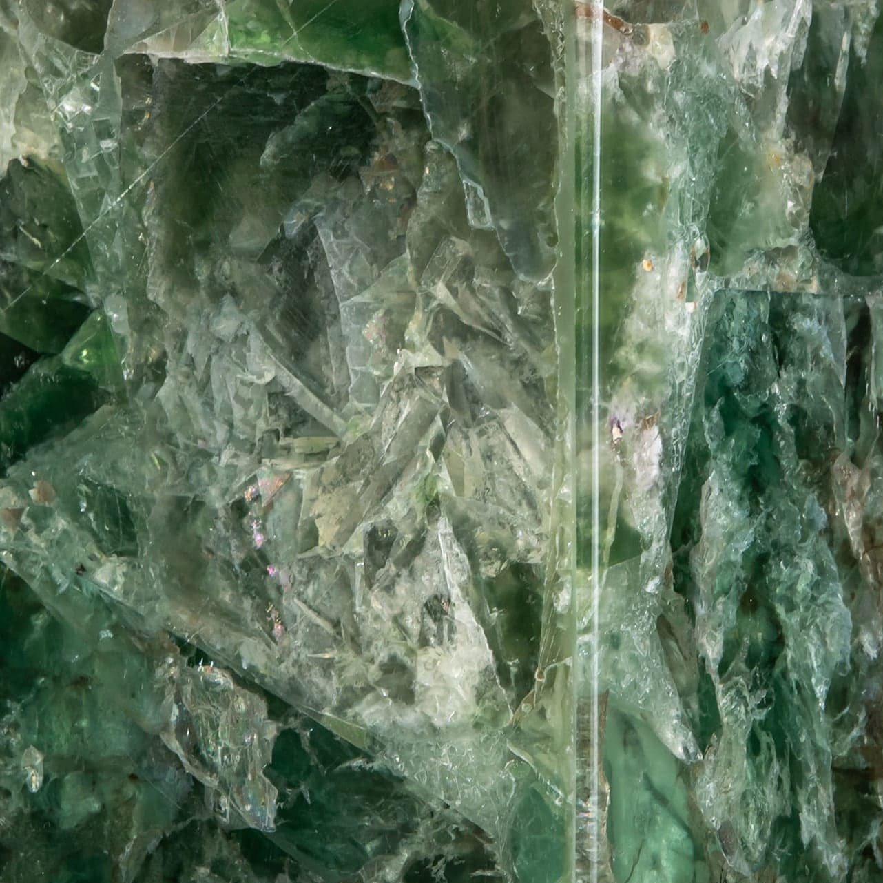 Its fractured crystalline patterns evoke frozen moss, glacial streams, and shifting aurora tones — a sculptural presence that balances raw mineral energy with architectural restraint.