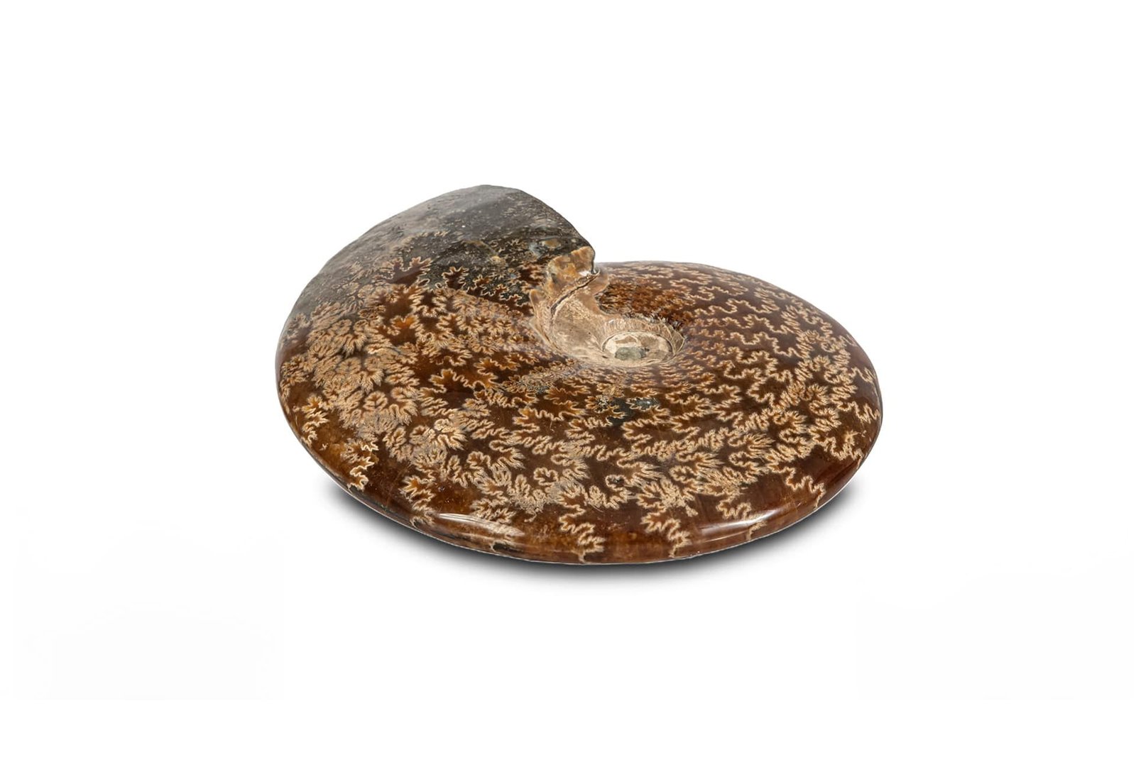 A polished ammonite fossil from Madagascar displaying intricate suture patterns and a warm, amber-toned palette. Its spiral geometry and naturally occurring fractal motifs transform a prehistoric form into a refined sculptural statement suitable for contemporary, curated interiors.