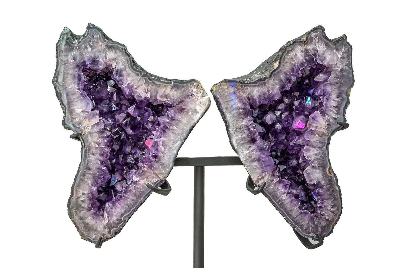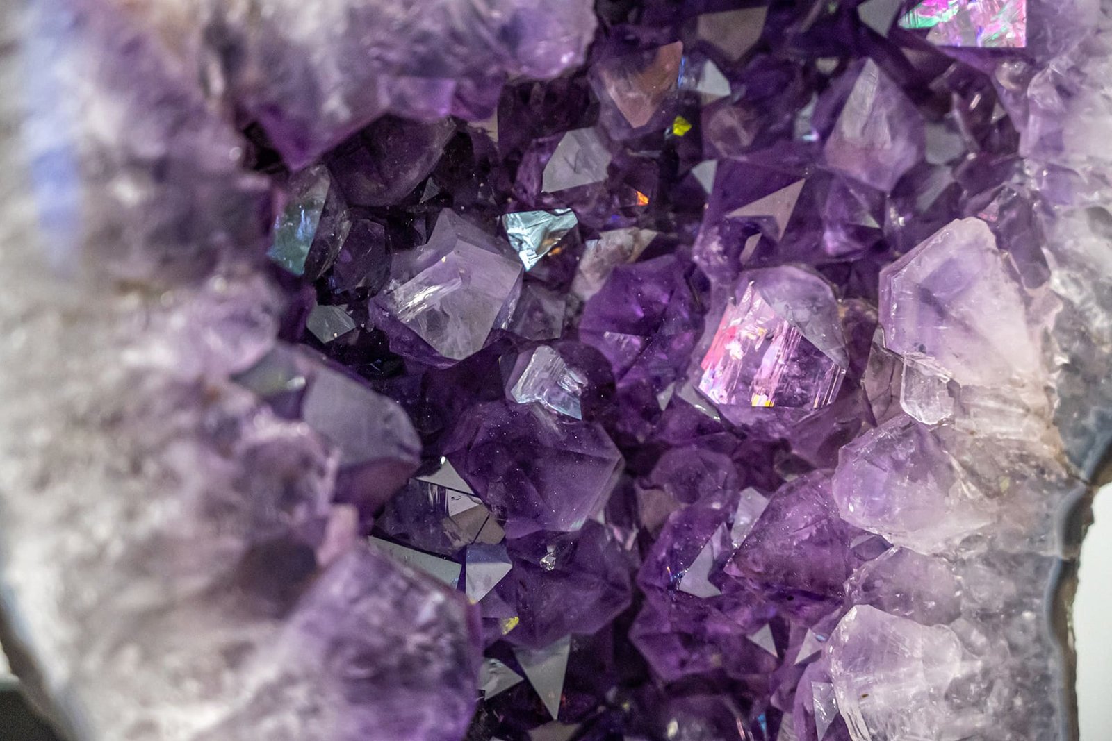 Uruguay amethyst is globally recognized for exceptional color depth, tight crystal formation, and high internal clarity. The piece showcases the region’s signature gradient—from charcoal edges to intense purple cores.