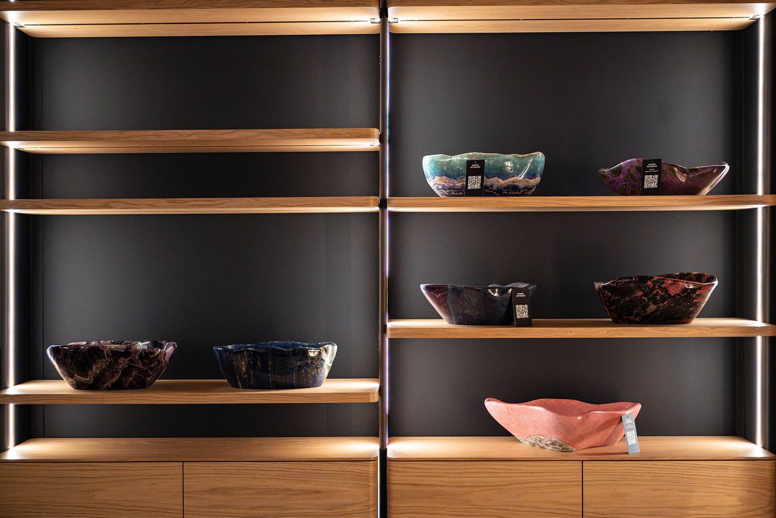 • Presentation of rare onyx, aragonite, and marble in curated lighting scenarios.