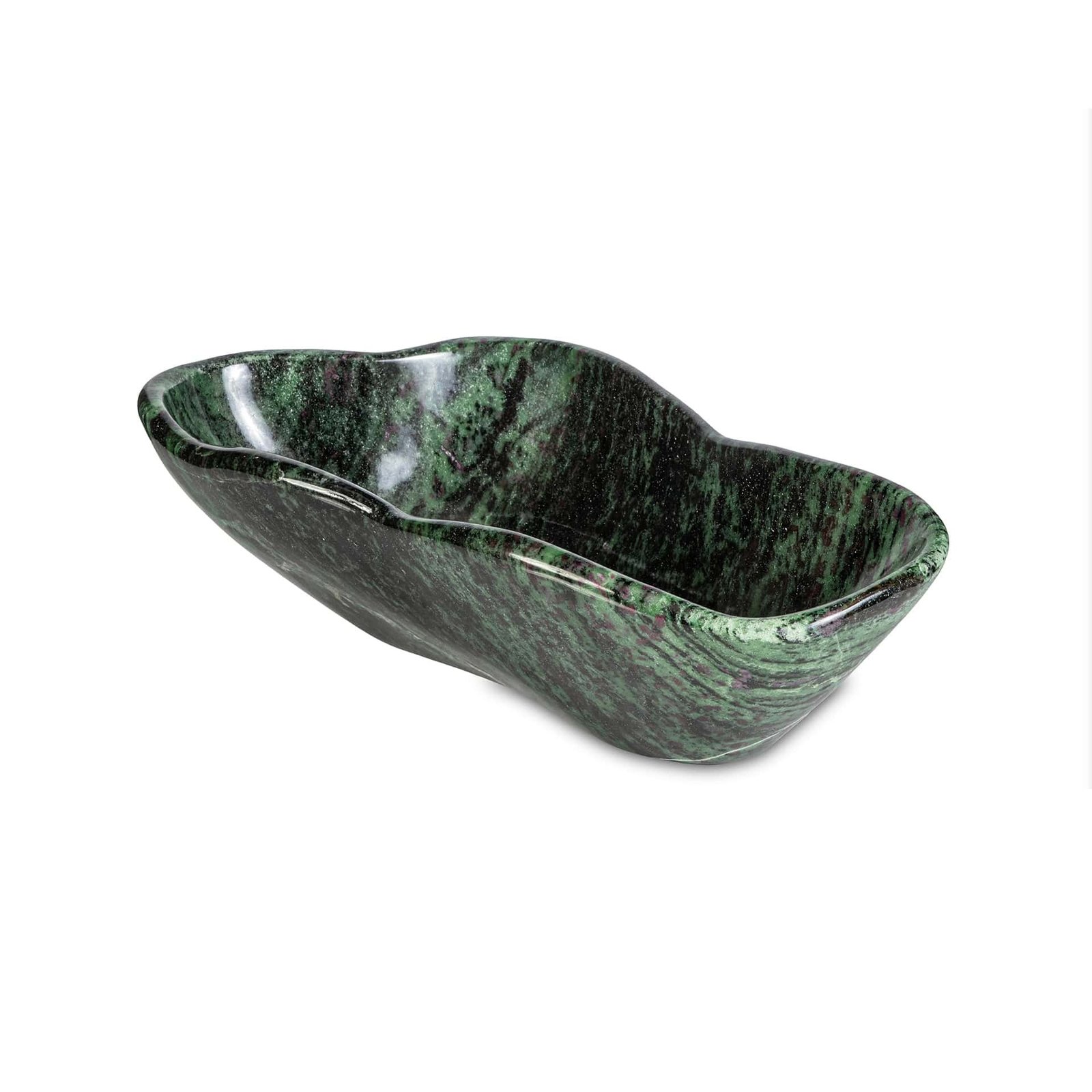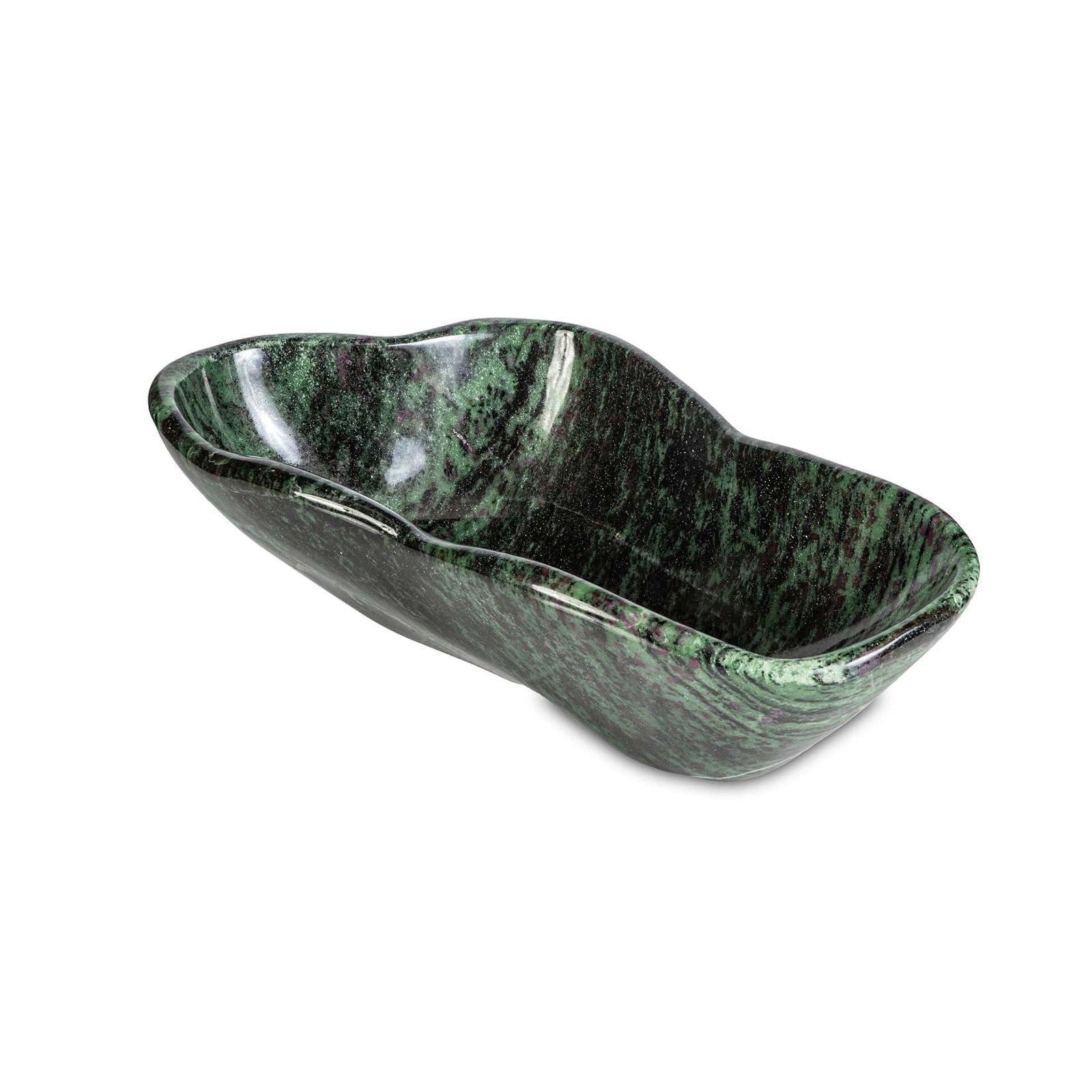 Deep green textures resemble shaded moss and ancient bark, while ruby inclusions flicker like hidden embers beneath the surface.